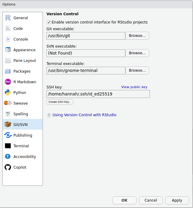 Optionswindow (above), clickCreate SSH Key... - If this does not work, enter this in the Terminal: