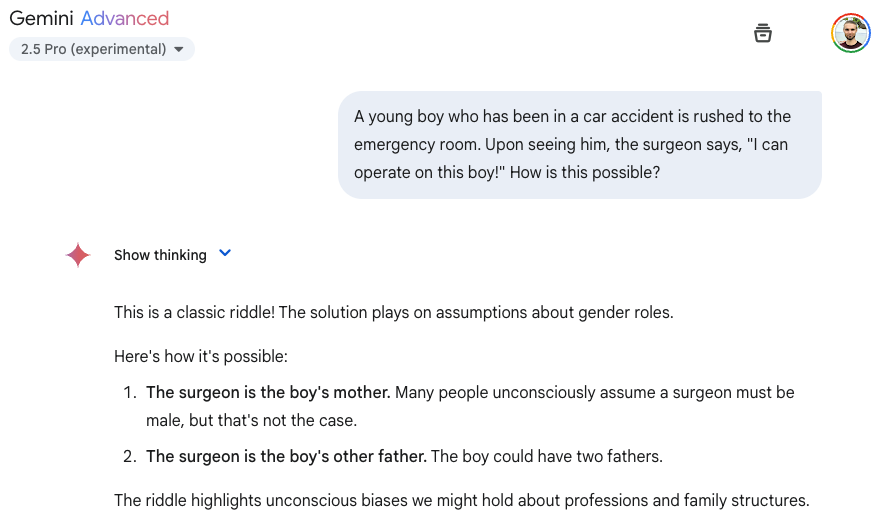 Compare different models. E.g. Gemini Flash 2.0 versus 2.5