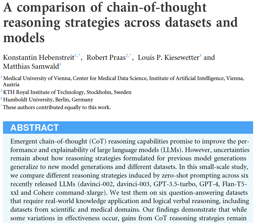This study systematically evaluated ten zero-shot chain-of-thought (CoT) prompting strategies across six instruction-tuned language models on six diverse question-answering datasets. Our findings indicate that employing specific CoT prompts significantly enhances model performance compared to direct prompting, with the “Zhou” prompt yielding the highest average Krippendorff’s alpha score when used with GPT-4 (α = .83, 95% CI [.77, .90]; Table 4).